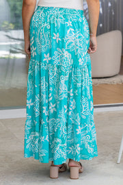 • Turquoise base with white oversized floral and paisley line-art motifs throughout.