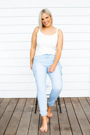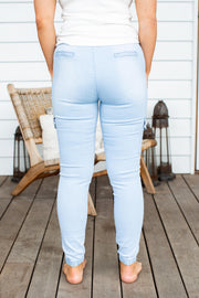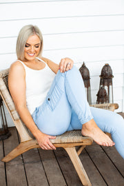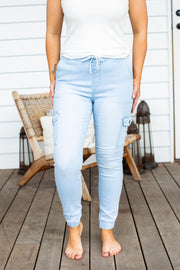 The comfiest run around denim pants you will find! The elastic waistband with drawstring makes them easy just to pull on when you need to run out the door.